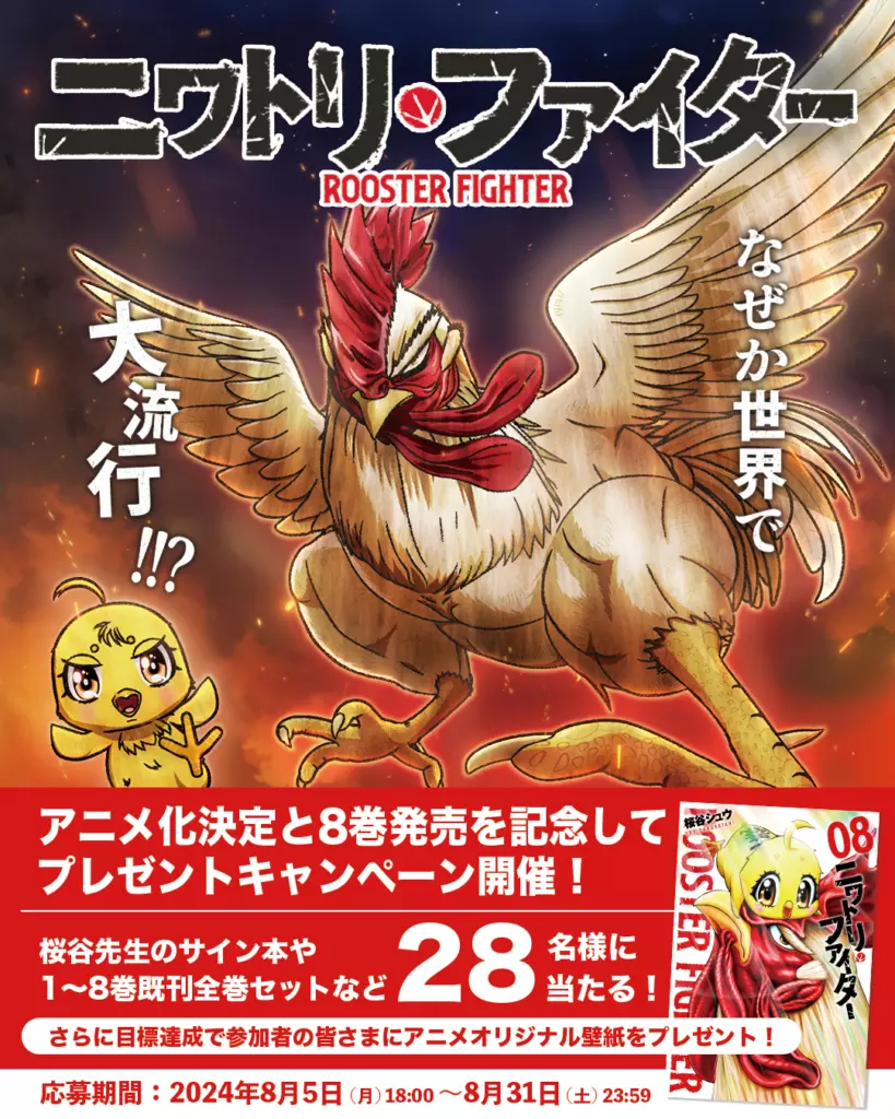 Manga aksi-komedi Rooster Fighter karya Shū Sakuratani resmi mendapat adaptasi anime TV dengan perilisan trailer perdana dan visual utama melalui Anime Expo 2025.